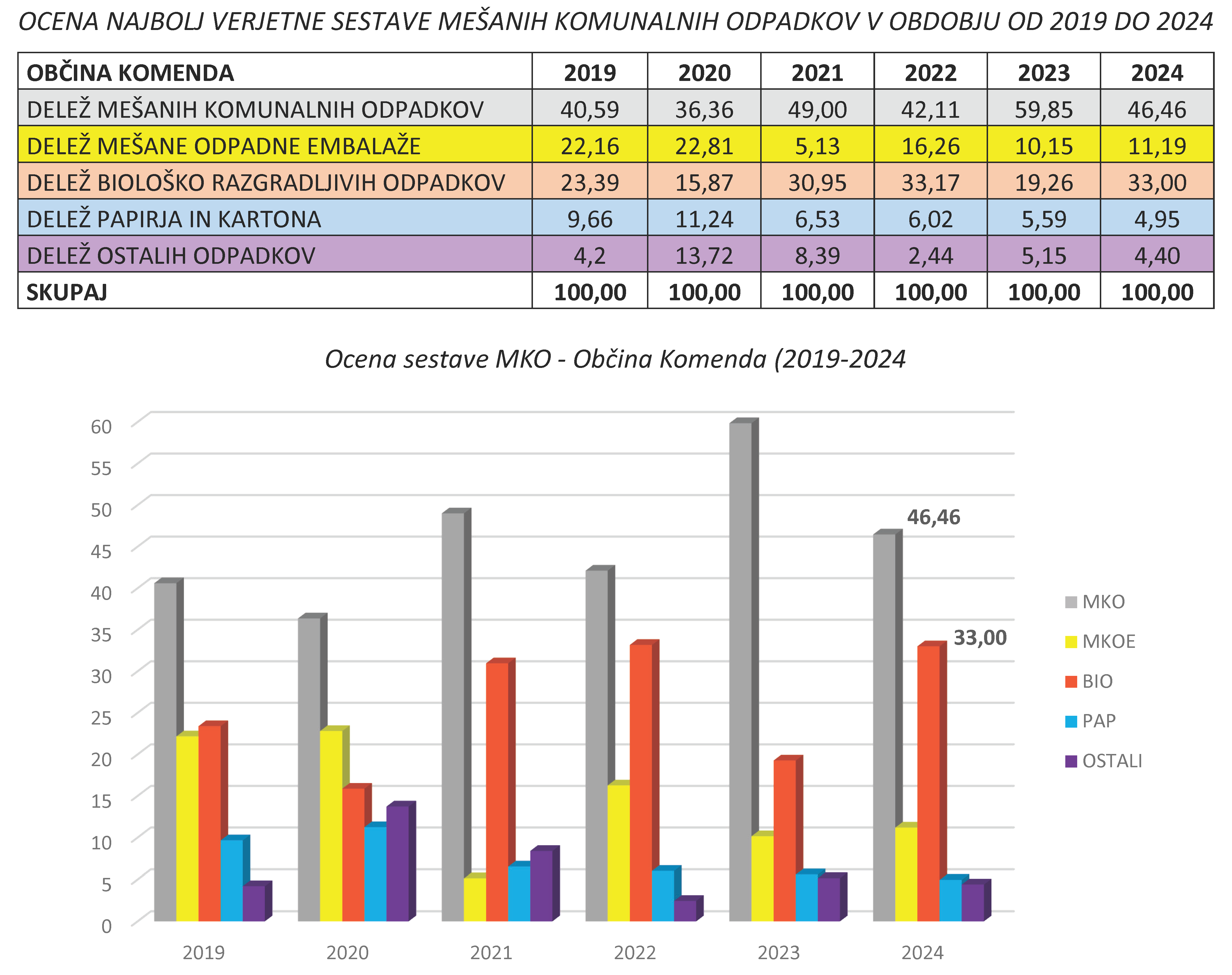 V podjetju PUBLIKUS d.o.o. 1-krat letno izvedemo analizo sestave mešanih komunalnih odpadkov, se pravi tistih odpadkov, ki jih uporabniki odlagate v črne posode. To pomeni, da izvedemo prebiranje naključno izbranega vzorca mešanih komunalnih odpadkov, ki ga razdelimo na 23 različnih skupin odpadkov. Tako razdeljene odpadke nato stehtamo in določimo najbolj verjetno sestavo mešanih komunalnih odpadkov na območju občine Komenda v posameznem koledarskem letu.